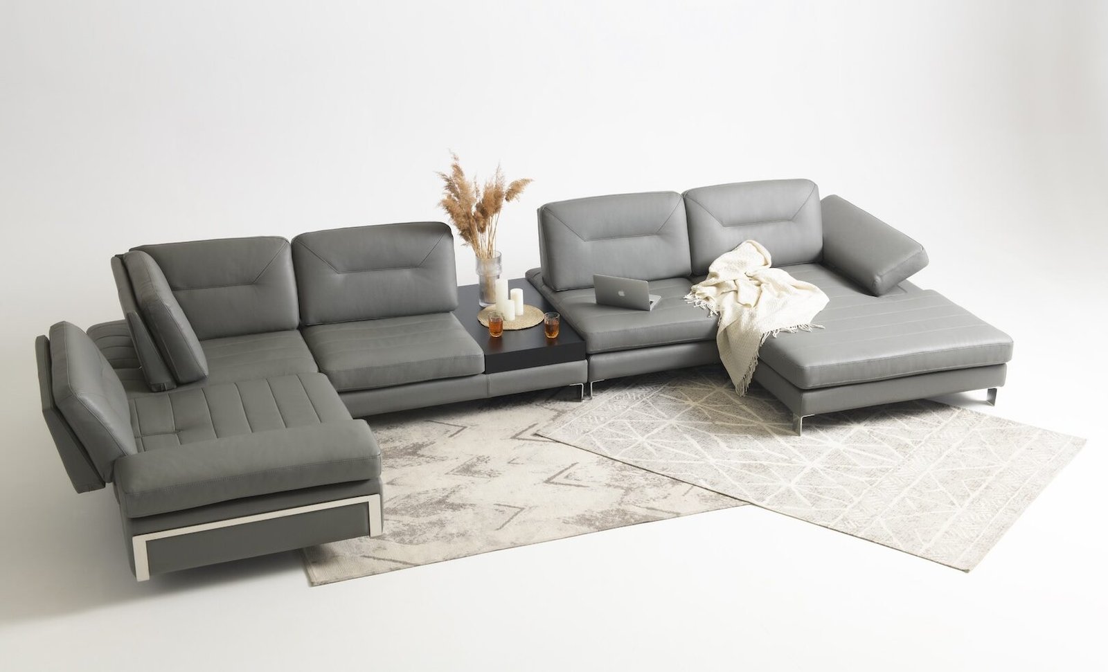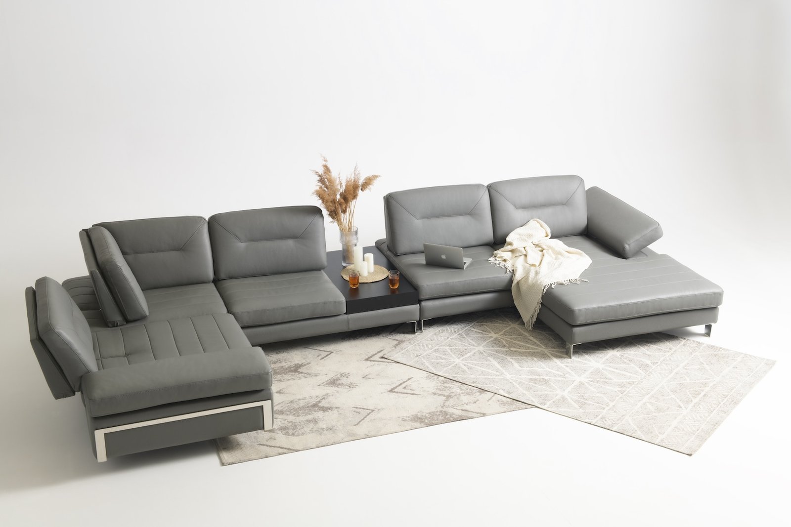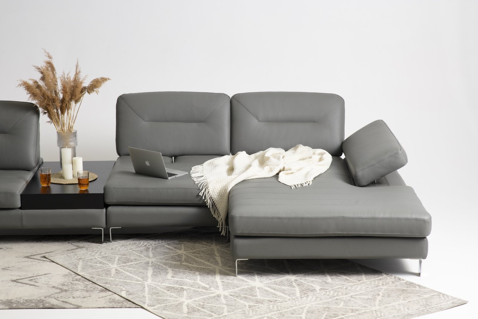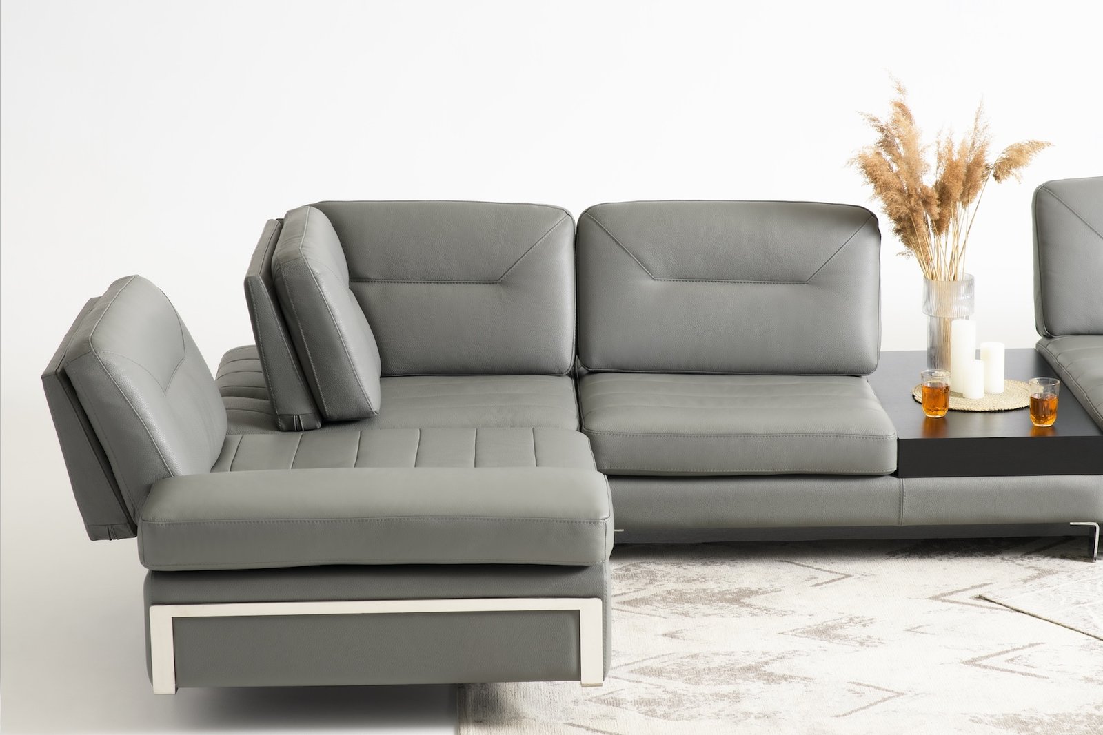 Утяжки на спинкових подушках, вишукана прострочка сидінь, хром-елемент під основою боковини та витончені металеві ніжки надають дивану розкішного та статусного вигляду. Бічна частина регулюється в положення лежачи, перетворюючись на зручний підголівник.